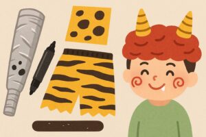 小物を足すことで、「作った衣装を着る」から「鬼になりきる体験」へと変化します。子どもの表情やテンションにも大きな違いが出るので、仕上げのひと工夫はとても効果的です。