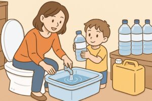 停電と違って、断水は「飲む・流す・洗う」のすべてに影響します。最優先は飲料水の確保とトイレの継続利用。家族構成に合わせて“数”で準備しておくと迷いません。家族4人なら「水36リットル(3L×3日×4人)+トイレ60回分(1人1日5回×3日)」が最低目安です。