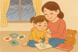 「大丈夫、ママもパパもここにいるよ」「台風は通り過ぎるだけだよ」と、やさしい声でそばにいてあげるだけでも、子どもの表情は少しずつ落ち着いていきます。