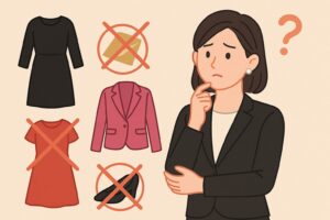 黒は引き締め効果があり便利ですが、上下とも黒だと重く、写真では陰影が強調されて喪服のように見えることがあります。黒を使う場合は「面積をしぼる or 明るい差し色を入れる」がコツ。