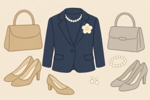 (おまけ)ストッキングはナチュラルベージュが基本。濃すぎる黒タイツは喪服感が出やすいので、肌寒い日は肌色に近いデニール薄めを選ぶと失敗が減ります。