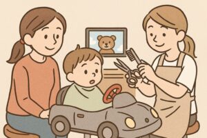 「やっぱりプロに任せたい」と思ったら、目安は1歳半〜2歳ごろ。この頃になると集中力が少しずつ育ち、椅子に5〜10分座っていられる子が増えます。とはいえ月齢よりも、その子の性格や生活リズムが大事。デビューの合図は、「座って待てる時間が5〜10分程度ある」ことです。