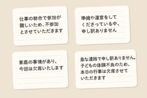 学校行事に参加できないとき、つい「もっと丁寧に言わなきゃ」と思ってしまいますが、実は理由を簡潔に伝えるだけで十分です。長々と言い訳をする必要も、過度に恐縮する必要もありません。先生も家庭の事情がさまざまあることを理解していますし、無理をして来てほしいとは思っていません。