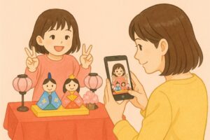 「子どもの顔・ひな人形・小物」の3つが全部見える位置関係になるよう、スマホの画面を見ながら微調整していくと、自然と“主役がどこか”はっきりした写真になります。撮る前に一度、子どもに立ってもらってから小物の位置を決めるとスムーズです。