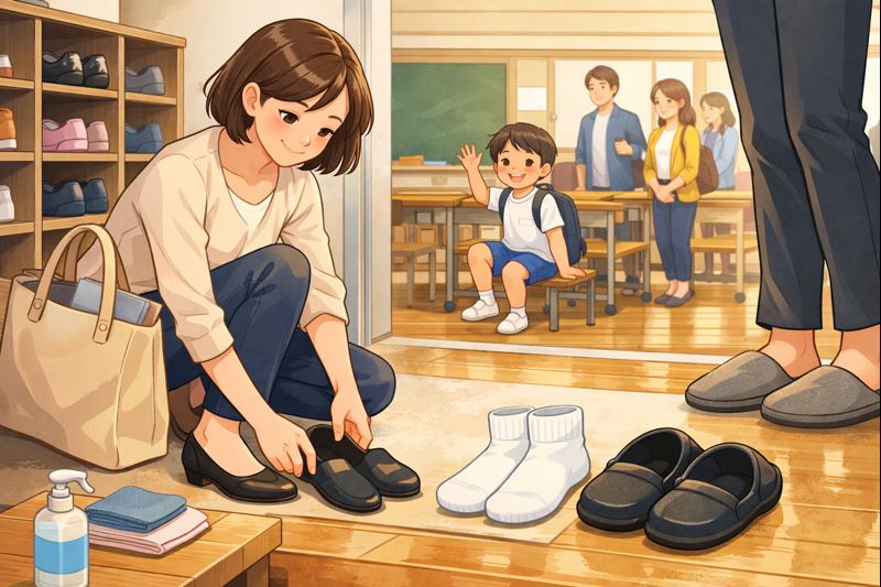 靴を脱ぐ学校の授業参観は、最初は「普通の参観と何が違うの?」と思いながらも、実際に経験してみると意外と気を使う場面が多いものですよね。でも、いくつかのポイントさえ意識しておけば、難しく構える必要はありません。清潔感のある落ち着いた服装、目立ちすぎない色味、整った靴下、静かに動けるスリッパ。この基本が押さえられていれば、周りの保護者や先生の目を気にしすぎることなく、安心して子どもの姿を見守ることができます。
