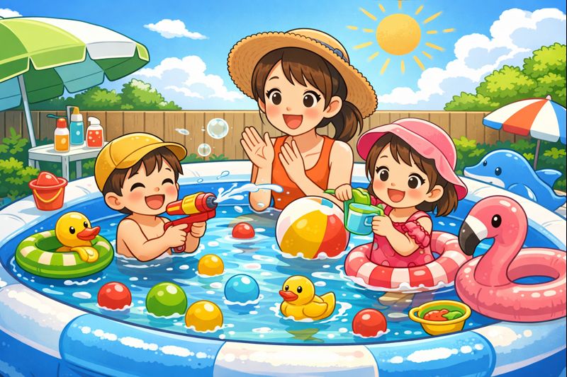 安全を第一に見守りつつ、少しの遊びアイデアや便利グッズを取り入れるだけで、いつものプールが特別な遊び場に変わります。たくさん準備しなくても大丈夫。完璧じゃなくても大丈夫。「親が無理をしすぎないこと」も、家庭用プールを楽しみ続けるための大切なポイントだと実感しています。