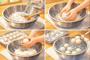 水が少ないと、成形の途中でひび割れしやすく硬めの食感になってしまい、水が多すぎると丸めにくく、茹でたときに形が崩れやすくなります。なので、“少しずつ・様子を見ながら”という進め方がとても大事でした。